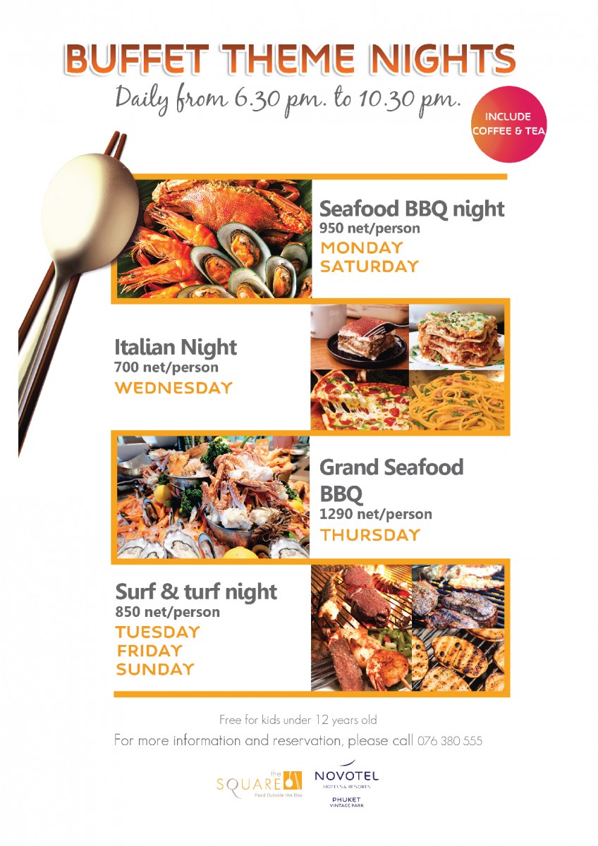 Join our themed Seafood BBQ, Italian Nights or Surf & Turf Nights at The Square Restaurant